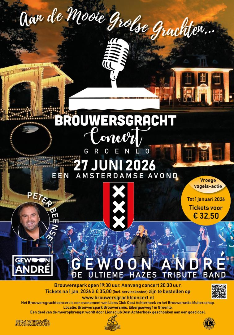 Op zaterdag 27 juni 2026 staat de 13-koppige formatie Gewoon André op het drijvende podium achter Brouwersnös. In een tweeënhalf uur durende show worden alle Hazes-meezingers op Toppers-waardige wijze vertolkt. Een zomeravond vol Amsterdamse sfeer, gezelligheid en herkenbare klassiekers onder de Groenlose sterrenhemel.